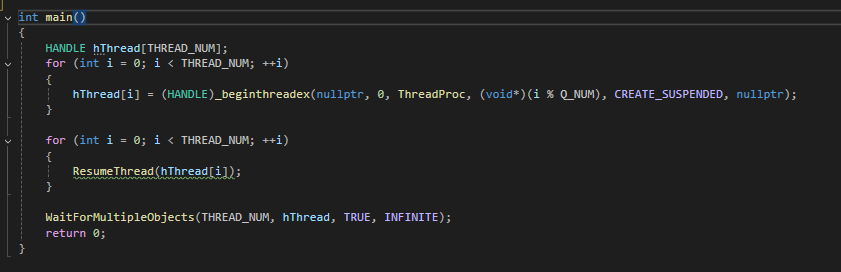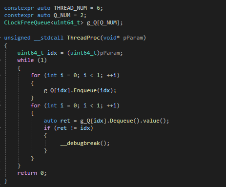 전역에 두개의 락프리큐가 선언되어있고 4개의 스레드중 2개는 0, 2개는 1번째 락프리큐에 인큐와 디큐를 반복한다.