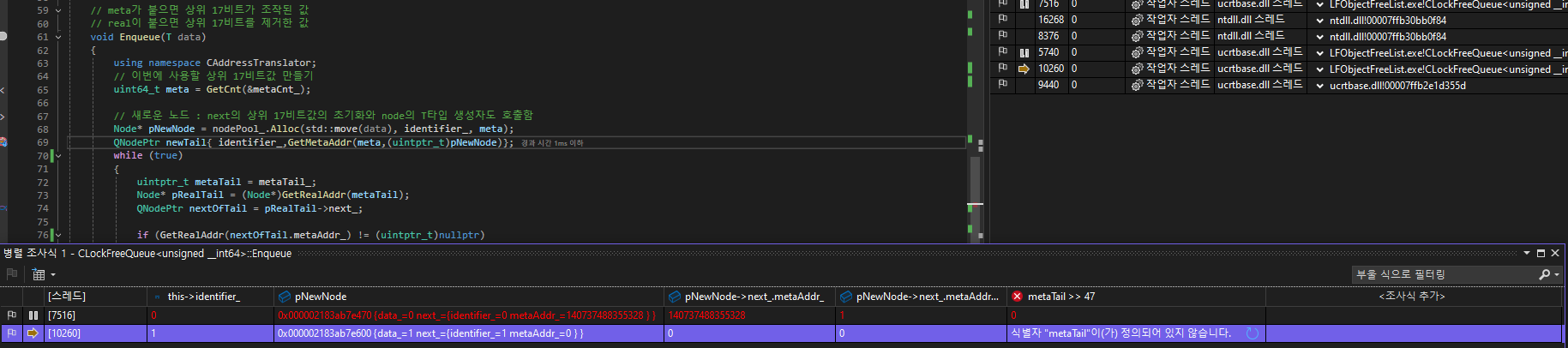 하지만 상기 위에서 우려한 상황이 재현되려면 7516번 스레드의 지역변수 metaTail과 10260스레드의 pNewNode.next_.metaAddr_의 상위 17비트가 같아야한다.
