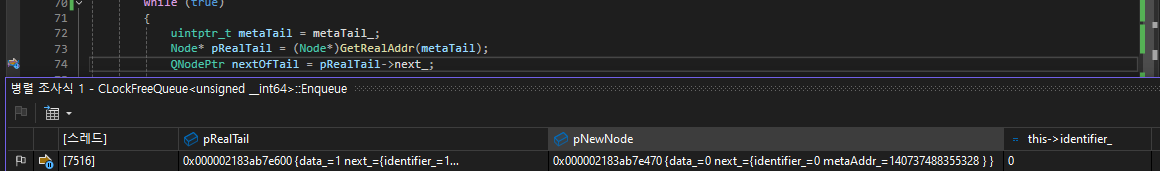 Q식별자가 0인 7516번 스레드는 pRealTail == 0x000002183ab7e600인 상황이며 이때 중지시킨다.
