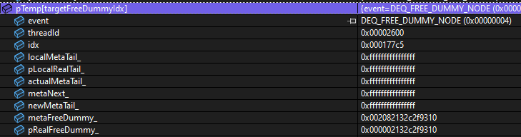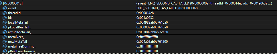 같은 스레드가 곧바로 2번 CAS를 시도햇으나 실제주소 2132c2f9310는 같으나 실제 metaTail의 값 actualMetaTail_이 4b02132cf9310으로 같아서 CAS가 실패함.