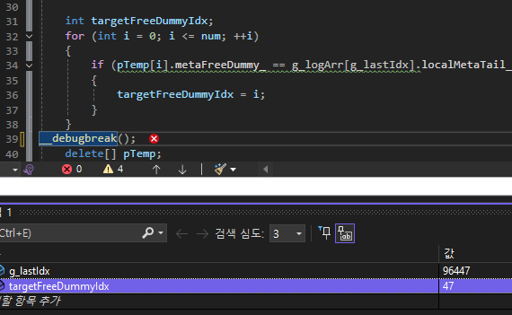 pTemp배열의 47번 인덱스의 로그에 FREE로그가 있음.
